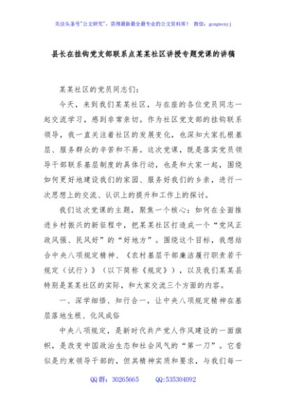 / 县长在挂钩党支部联系点某某社区讲授专题党课的讲稿