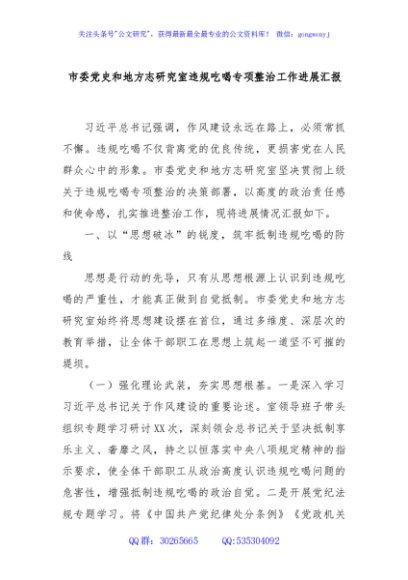 / 市委党史和地方志研究室违规吃喝专项整治工作进展汇报