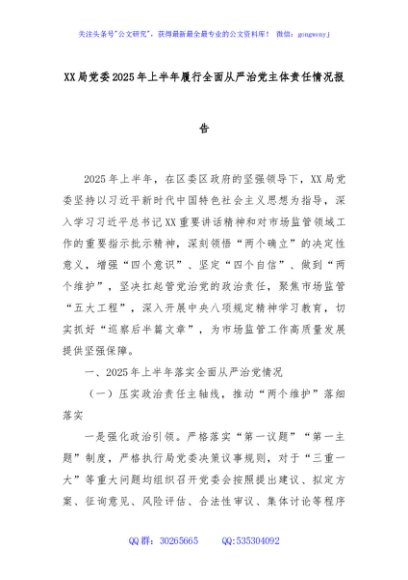 / XX局党委2025年上半年履行全面从严治党主体责任情况报告
