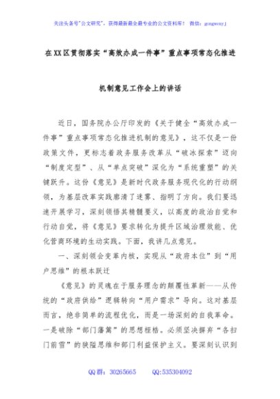 / 在XX区贯彻落实“高效办成一件事”重点事项常态化推进机制意见工作会上的讲话