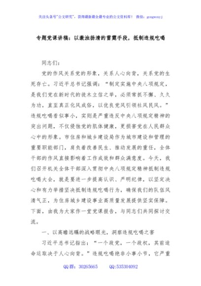 / 专题党课讲稿:以激浊扬清的雷霆手段,抵制违规吃喝