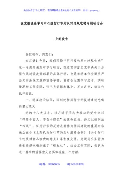 / 在党组理论学习中心组厉行节约反对违规吃喝专题研讨会上的发言