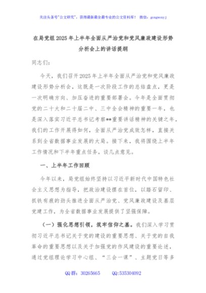 / 在局党组2025年上半年全面从严治党和党风廉政建设形势分析会上的讲话提纲
