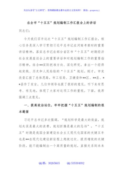 / 在全市“十五五”规划编制工作汇报会上的讲话