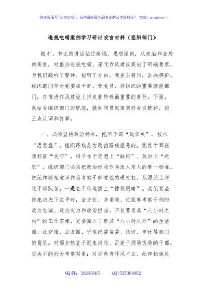 / 违规吃喝案例学习研讨发言材料(组织部门)