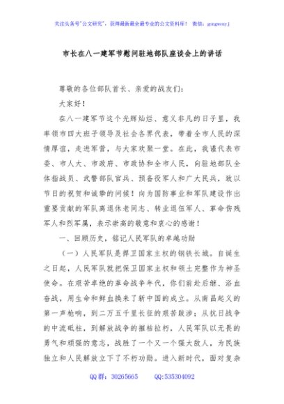 / 市长在八一建军节慰问驻地部队座谈会上的讲话