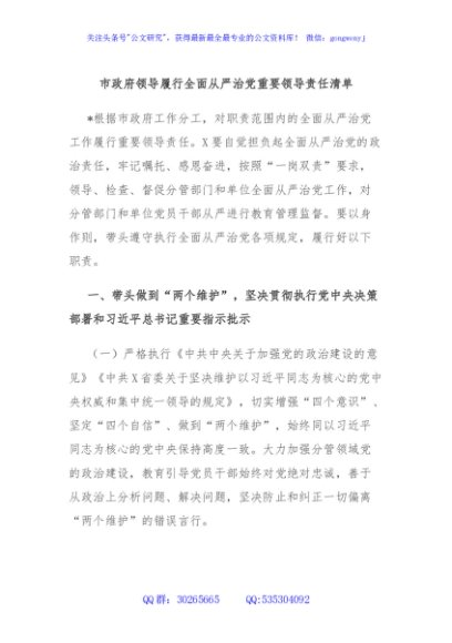 市政府领导履行全面从严治党重要领导责任清单