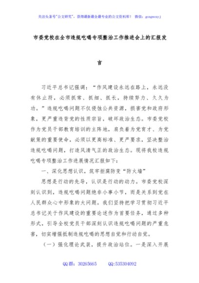 / 市委党校在全市违规吃喝专项整治工作推进会上的汇报发言