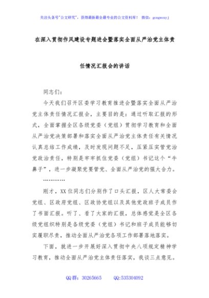 / 在深入贯彻作风建设专题进会暨落实全面从严治党主体责任情况汇报会的讲话