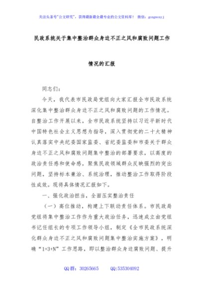 / 民政系统关于集中整治群众身边不正之风和腐败问题工作情况的汇报