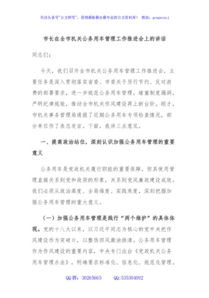 / 市长在全市机关公务用车管理工作推进会上的讲话