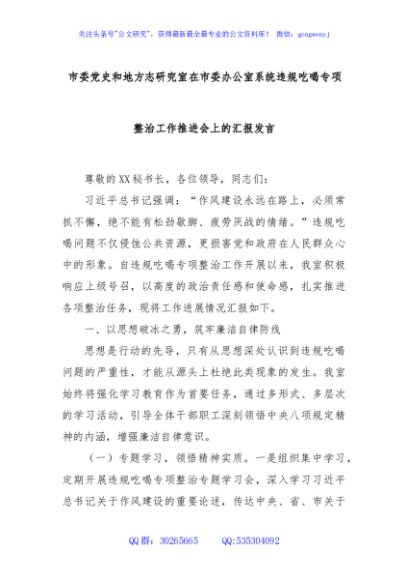 / 市委党史和地方志研究室在市委办公室系统违规吃喝专项整治工作推进会上的汇报发言