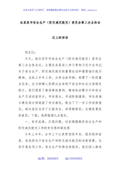 / 在某某市安全生产(防灾减灾救灾)委员会第三次全体会议上的讲话