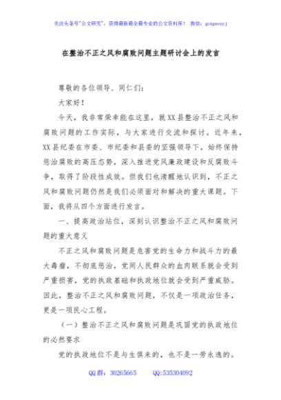 / 在整治不正之风和腐败问题主题研讨会上的发言