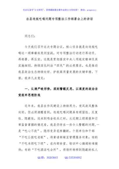 / 在县违规吃喝问题专项整治工作部署会上的讲话