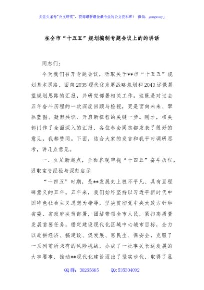 / 在全市“十五五”规划编制专题会议上的的讲话