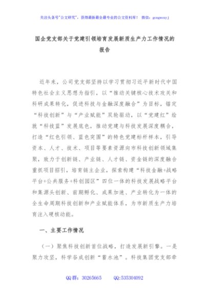 / 国企党支部关于党建引领培育发展新质生产力工作情况的报告