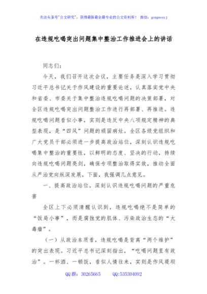 / 在违规吃喝突出问题集中整治工作推进会上的讲话