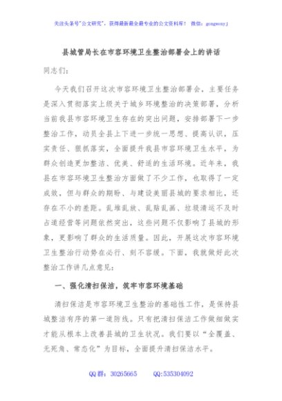 / 县城管局长在市容环境卫生整治部署会上的讲话