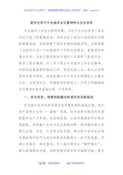副市长学习中央城市会议精神研讨发言材料