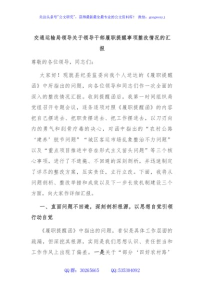/ 交通运输局领导关于领导干部履职提醒事项整改情况的汇报