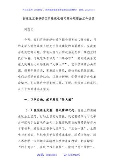/ 街道党工委书记关于违规吃喝问题专项整治工作讲话
