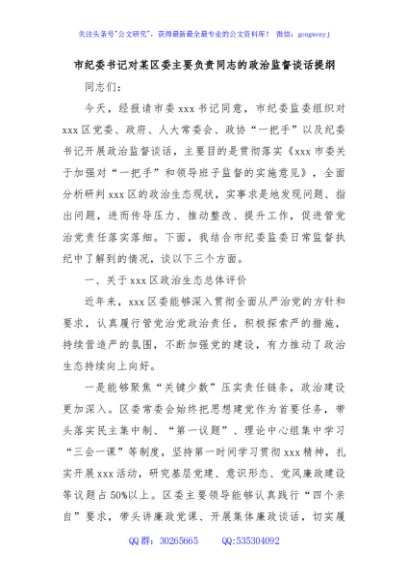 / 市纪委书记对某区委主要负责同志的政治监督谈话提纲