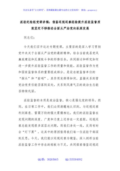 / 派驻纪检组党课讲稿:借鉴巡视巡察经验提升派驻监督质效坚定不移推动全面从严治党向纵深发展