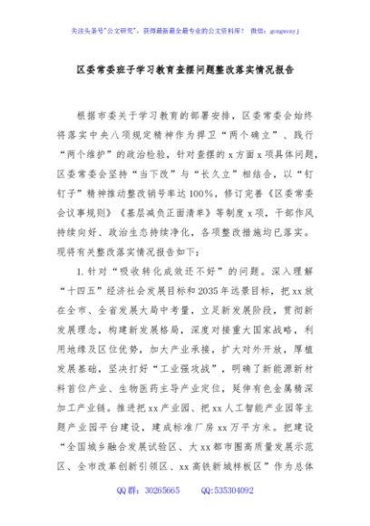 / 区委常委班子学习教育查摆问题整改落实情况报告