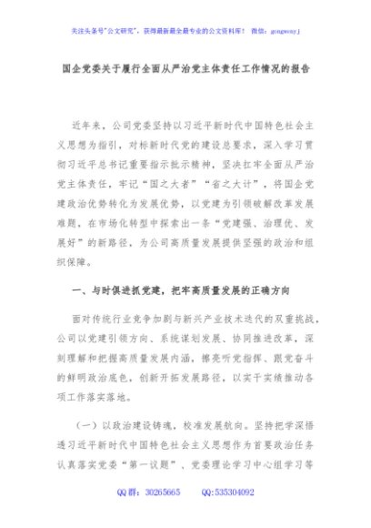 / 国企党委关于履行全面从严治党主体责任工作情况的报告