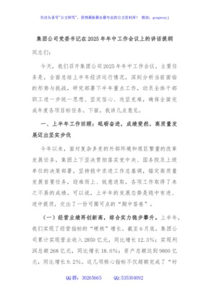 / 集团公司党委书记在2025年年中工作会议上的讲话提纲