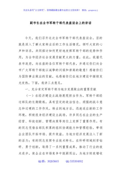 / 副市长在全市军转干部代表座谈会上的讲话