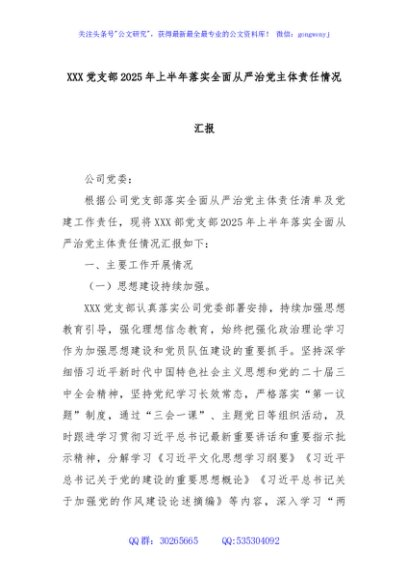 / XXX党支部2025年上半年落实全面从严治党主体责任情况汇报