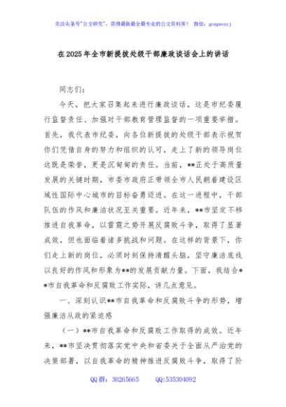 / 在2025年全市新提拔处级干部廉政谈话会上的讲话