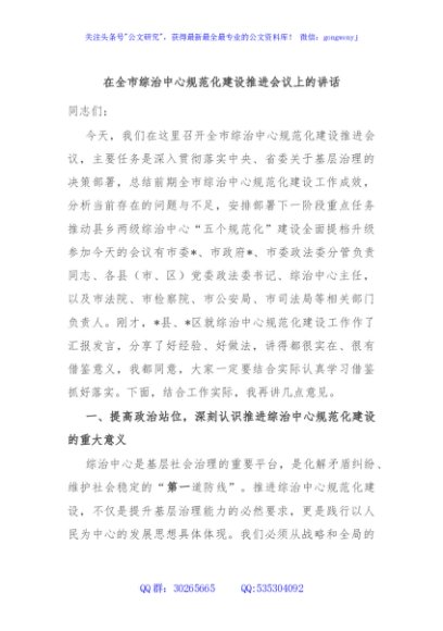 / 在全市综治中心规范化建设推进会议上的讲话