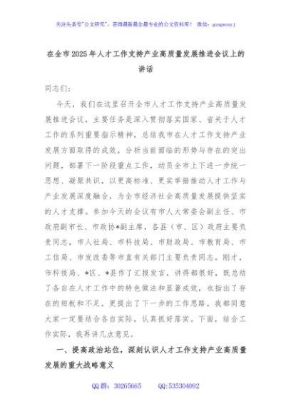 / 在全市2025年人才工作支持产业高质量发展推进会议上的讲话