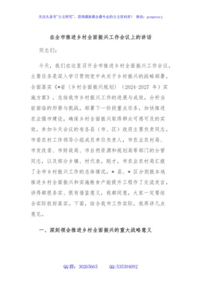 / 在全市推进乡村全面振兴工作会议上的讲话