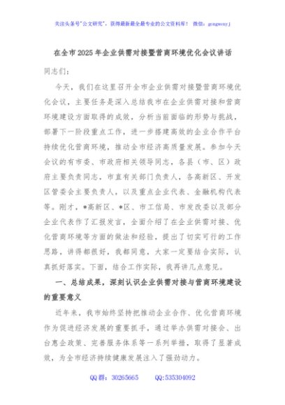 / 在全市2025年企业供需对接暨营商环境优化会议讲话