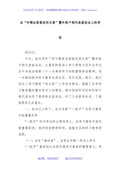 / 在“专题全面落实回头看”暨年轻干部代表座谈会上的讲话