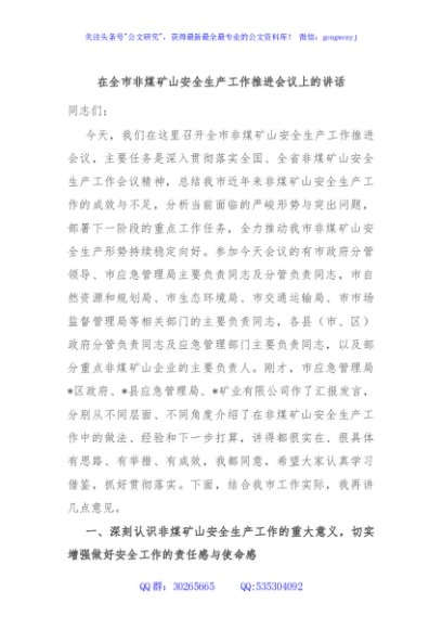 / 在全市非煤矿山安全生产工作推进会议上的讲话