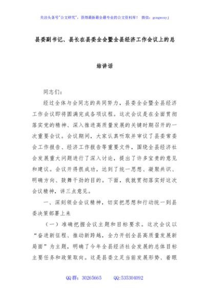 / 县委副书记、县长在县委全会暨全县经济工作会议上的总结讲话