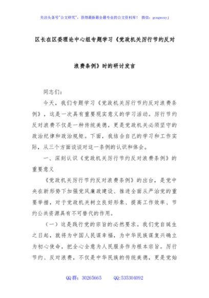 / 区长在区委理论中心组专题学习《党政机关厉行节约反对浪费条例》时的研讨发言
