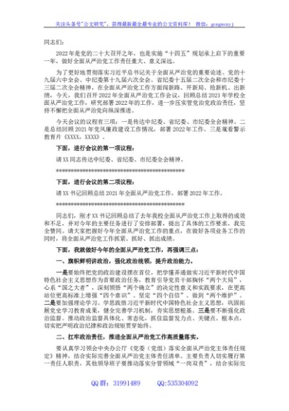 / 在(学校)2022年全面从严治党工作会议主持词