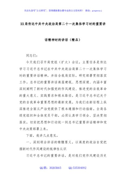 / XX局传达中共中央政治局第二十一次集体学习时的重要讲话精神时的讲话(精品)