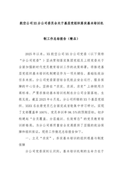 / 航空公司XX分公司委员会关于基层党组织落实基本培训机制工作总结报告(精品)