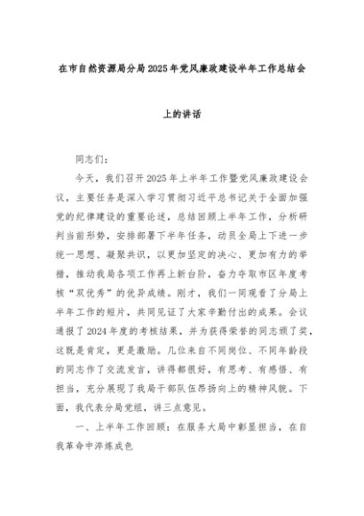 / 在市自然资源局分局2025年党风廉政建设半年工作总结会上的讲话