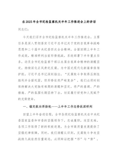 / 在2025年全市纪检监察机关半年工作推进会上的讲话