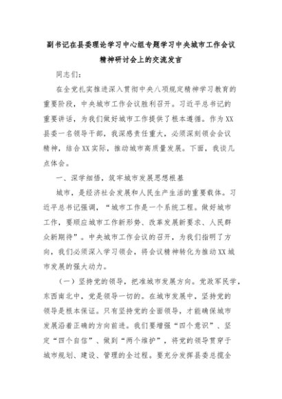 / 副书记在县委理论学习中心组专题学习中央城市工作会议精神研讨会上的交流发言