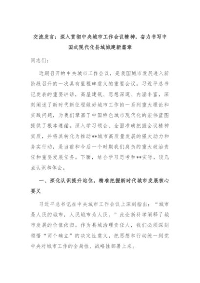 / 交流发言:深入贯彻中央城市工作会议精神,奋力书写中国式现代化县域城建新篇章