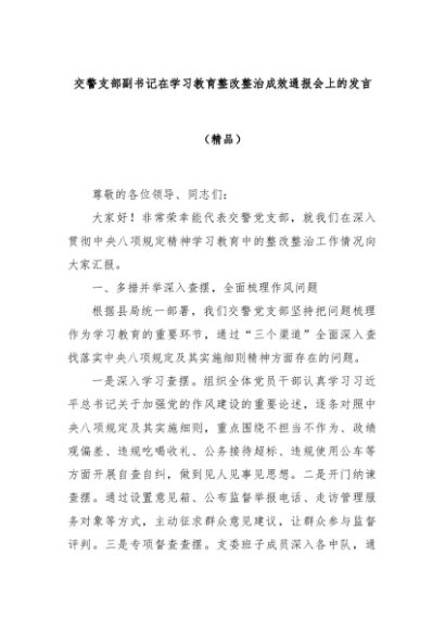 / 交警支部副书记在学习教育整改整治成效通报会上的发言(精品)